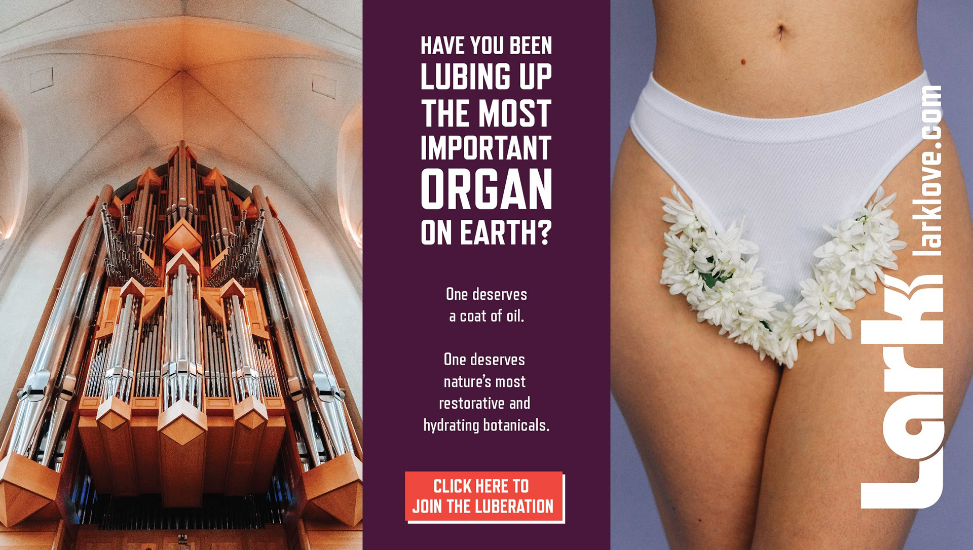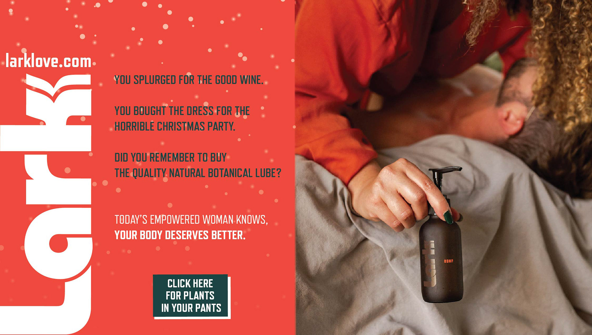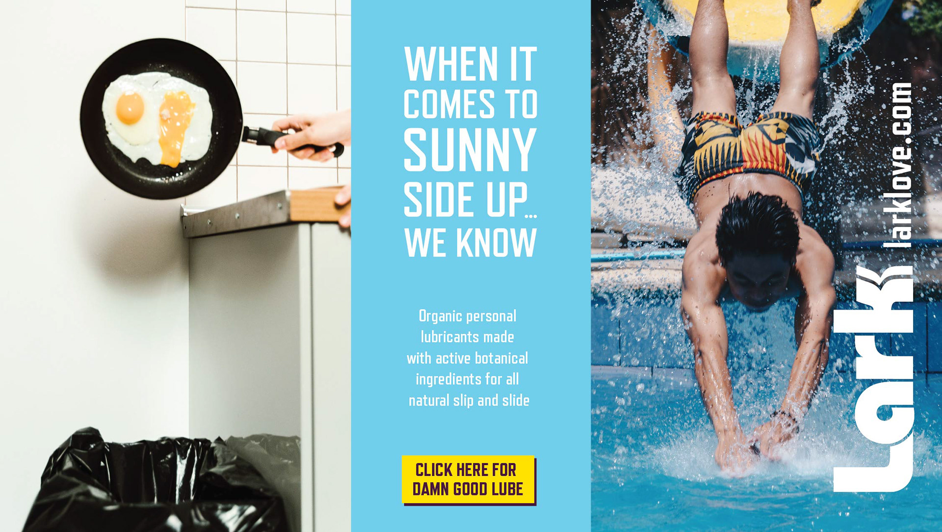 In a world saturated with advertising, Lark wanted something that would really make the viewer sit up and pay attention. The key was to use bold imagery and cheeky copy to poke fun at the way we talk about "lube". I designed a series of ads for online distribution as well as coming up with all of the copy shown.