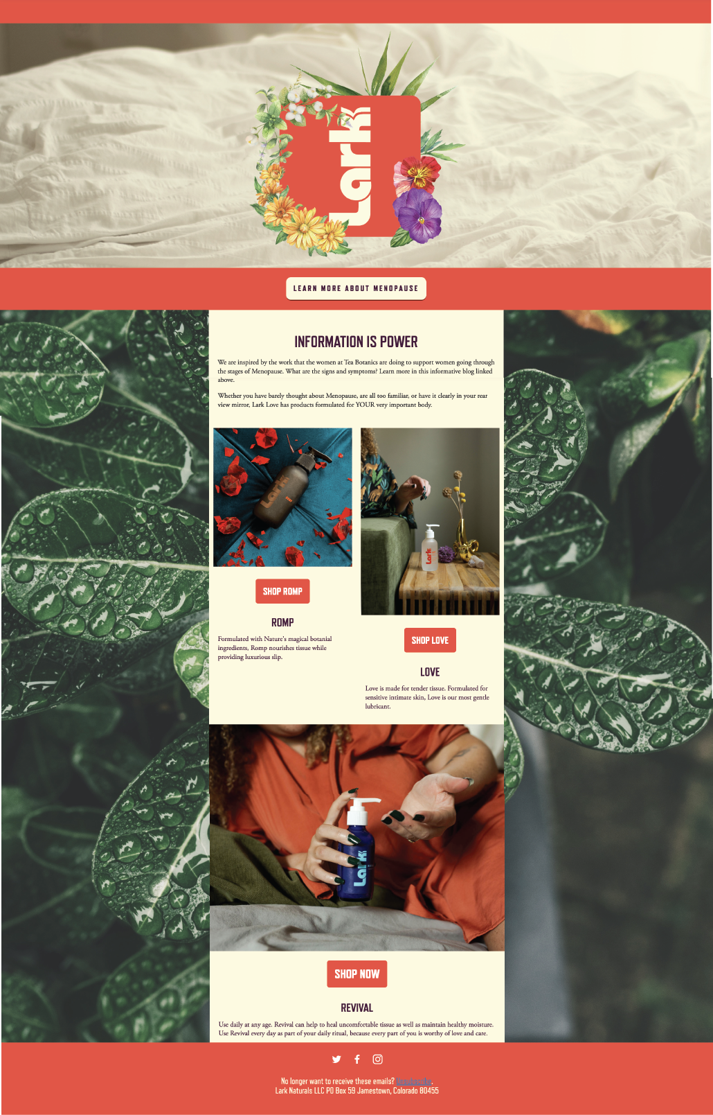 "Lark Love is a revolutionary botanical women’s body care business changing the narrative about women’s bodies. Lark’s mission is to empower women in the way they view and treat their bodies and their sexual wellness by creating luxury products that nourish rather than shame." - Lark Mission Statement