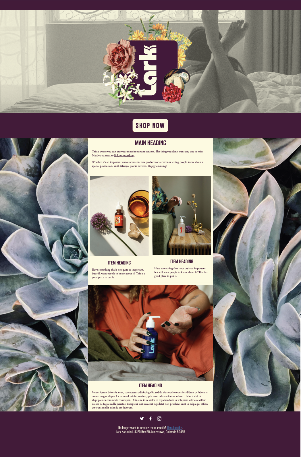I have also created several email templates, using Klayvio, to increase their brand's reach. The colors and the imagery really capture the all-natural, botanical aspects of their product and create a cozy feeling for the recipient to be enveloped in a safe space to talk and learn about sexual wellness and body positivity.